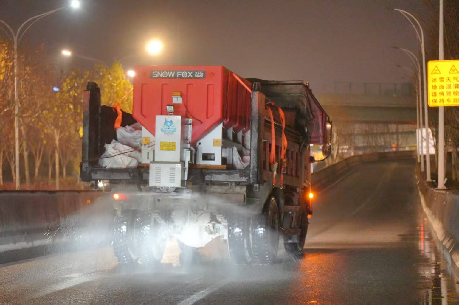 平台指挥,一线响应。平台发出指令10分钟后,硚孝高速匝道口,区服投临空港市政环卫公司的重装队司机已驾驶着三台撒布机开始作业。机器缓缓前行,融雪剂被均匀地布撒在路面上。“白天我们已经对包保的几条重点道路完成了巡查。夜里气温低,匝道、桥梁这些地方最容易结冰,必须抢在前面预防。”区服投集团公共设施运营管理公司副经理韩一新说道。据了解,一台撒布机可满载4吨融雪剂,能连续作业90多分钟,覆盖10公里路段,这样的科学布撒,正是基于平台对易结冰点位的精准研判。
