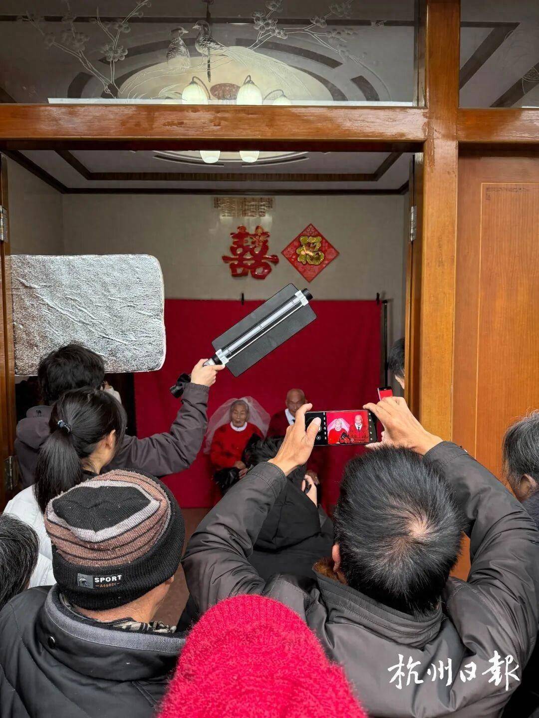 原来,村里一对百岁夫妻拍结婚照,邻居们都来沾沾喜气!
