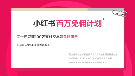 小红书电商此前佣金(官方称基础技术服务费率)按类目有所不同,多数集中在2%-5%。“百万免佣计划”将前100万元支付交易额费率统一降至0.6%,简化商家计算。