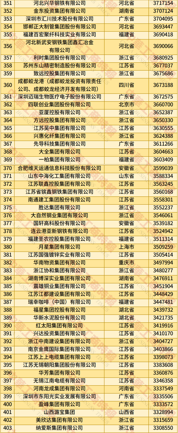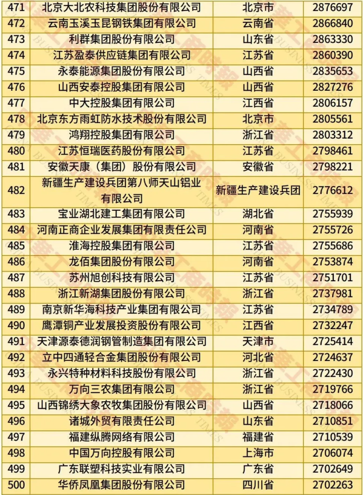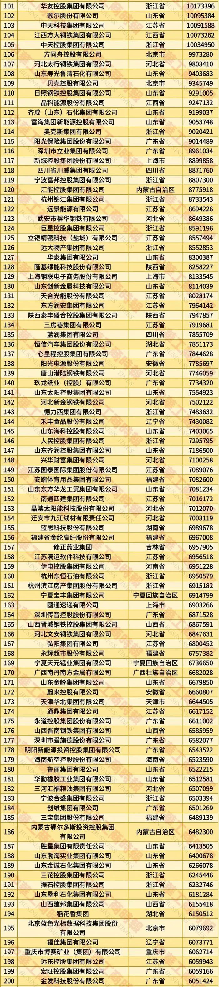 此次民营企业500强入围门槛增至270.23亿元;营业收入总额达到43.05万亿元;净利润合计1.80万亿元;研发费用总额1.13万亿元,研发人员总数115.17万人,平均研发经费投入强度2.77%;纳税总额达1.27万亿元,纳税额超过10亿元的企业有240家,占500强比例为48.00%。