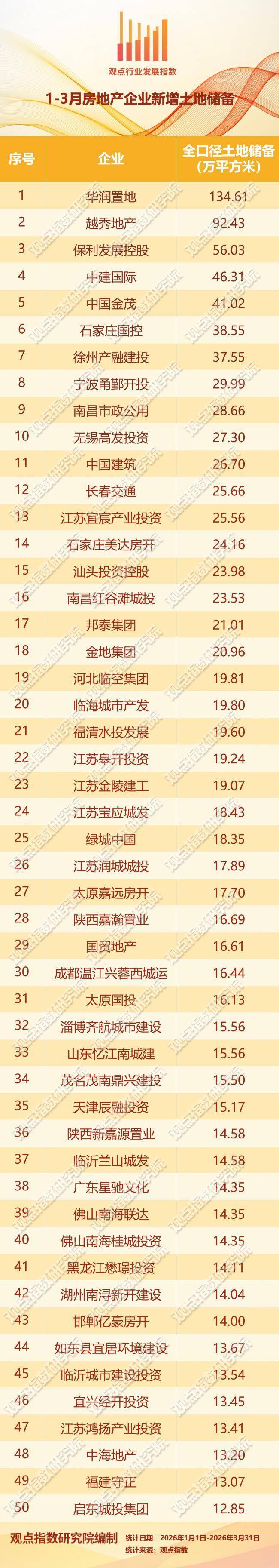 观点指数发布的房地产企业新增土地储备报告显示,报告期内前50房企1-3月新增土地建筑面积1229.12万平方米,同比下降33.11%。