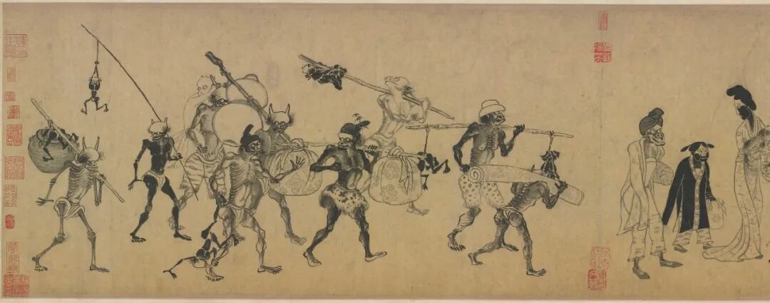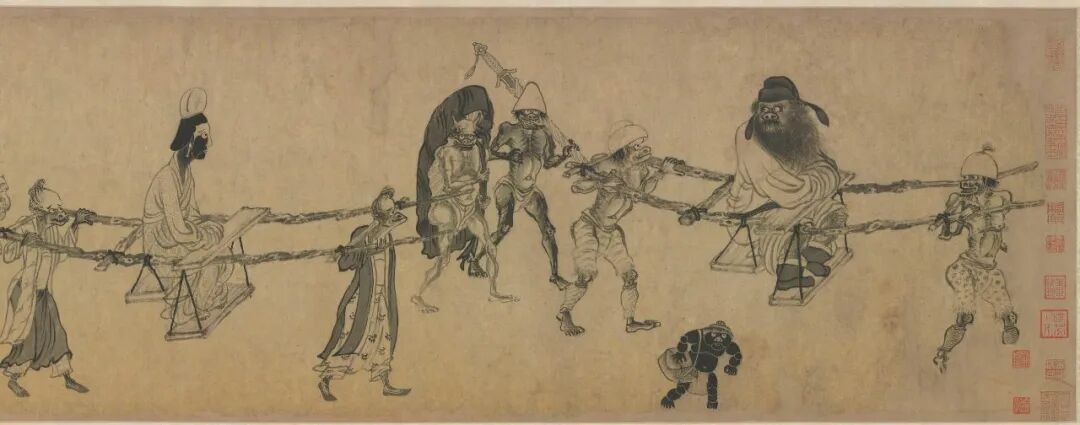 在宋代的钟馗画中,钟馗身边多了一个女子,她就是钟馗的妹妹。比如宋末元初龚开的《中山出游图》,描绘了钟馗和小妹乘舆出游的情景,他们身边跟着形态各异的鬼卒,有的挑衣包,有的挟卷席,有的背篓筐,有的负葫芦,钟馗环目虬须,回过头来深情看着妹妹,满是疼爱之情。