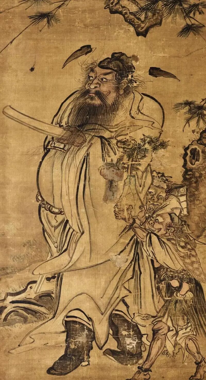 这个故事出自北宋沈括的《梦溪笔谈》,更早的版本可以追溯到唐代文人的笔记,比如晚唐周繇也写了玄宗梦鬼的故事,更详细地描述这位捉鬼大神的样貌:圆颅、长髯、阔臆,着斜开领蓝衫,戴危冠,手执凤管、竹简等法器,舞动时如虎跳幽谷、龙跃深渊,万鬼莫近,离去时烟云忽起,雨雹交加,不留痕迹。