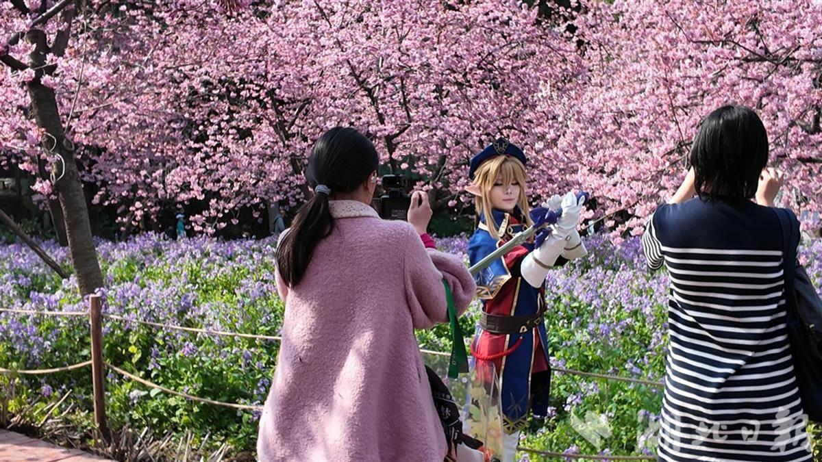 去年此时,大林也是泡在樱花园里。“从开园拍到闭园,整整一个月,看着樱花一步步开起来。”他对园里每一片花海的花期和位置了如指掌——早樱开在入园右手边桥头,现已近尾声;往里走,过一座小桥,大片白樱正要绽放,那是中樱;晚樱在三月底四月初,藏在园子出口处,格外密集。