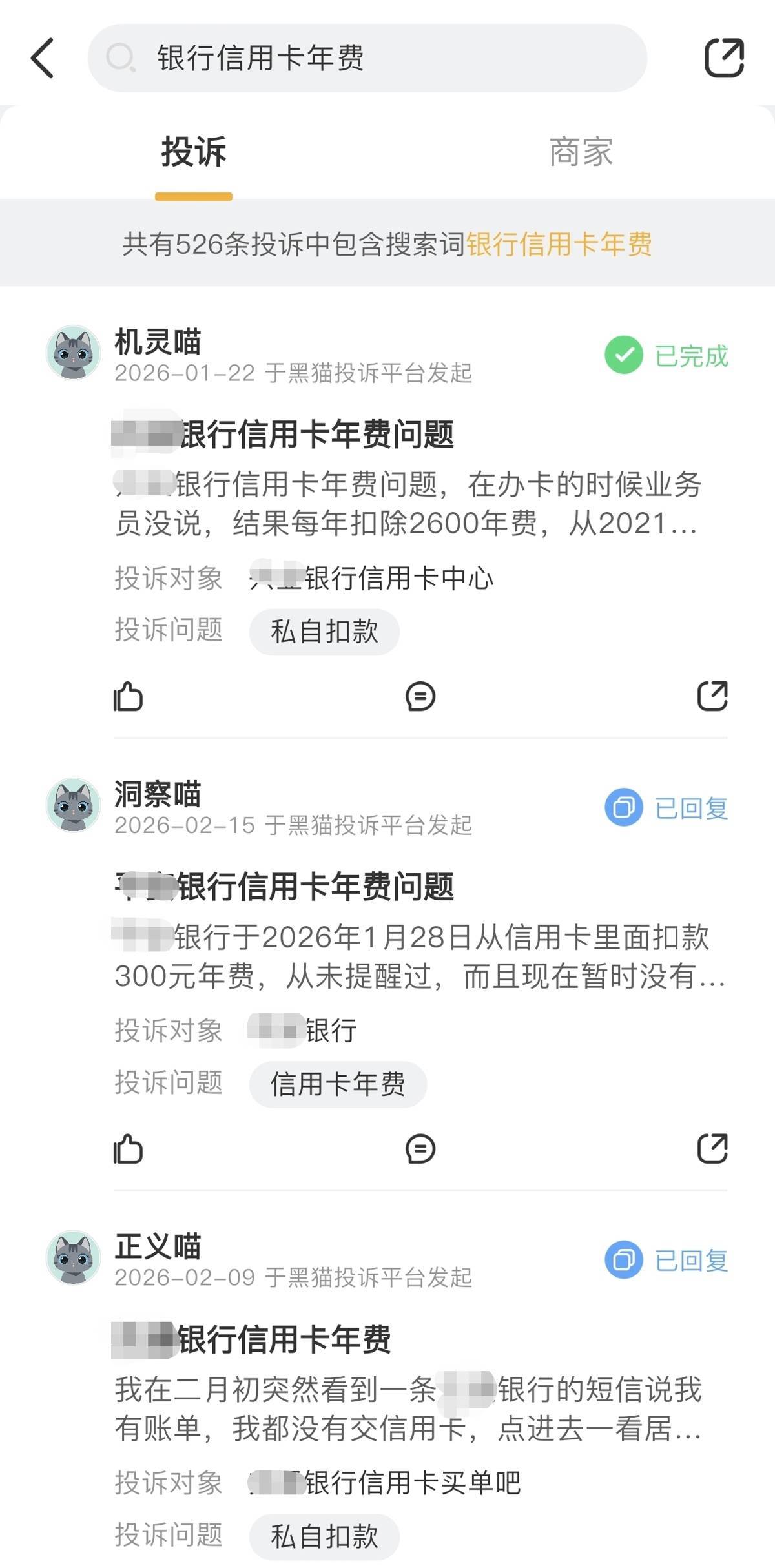 极目新闻记者注意到,在黑猫投诉平台上以“银行信用卡年费”为关键字进行搜索,有不少网友遇到过和李先生类似的情况,认为银行在扣费前未尽到充分提醒的义务。