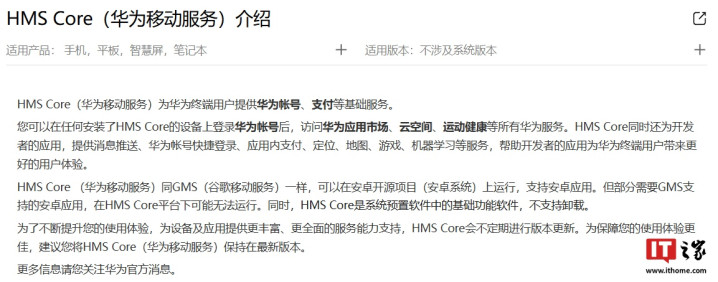 据IT之家了解,HMSCore是为华为终端用户提供华为账号、支付等基础服务的工具。华为官网显示,用户可以在任何安装了HMSCore的设备上登录华为账号后,访问华为应用市场、云空间、运动健康等所有华为服务。