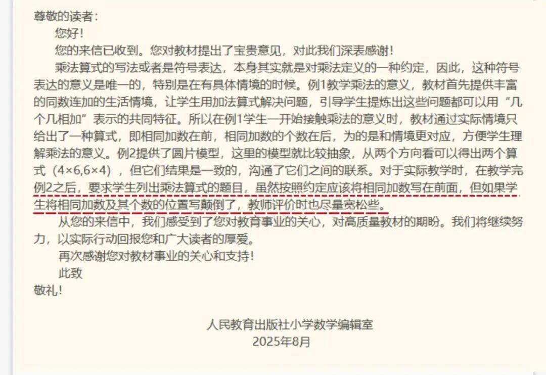 媒体报道中,小朋友写了3×8,却被老师判错。有老师在家长群解释,写乘法算式,先找每份数写在前面,再找有几份写在后面。一位来自福州的数学名师表示,“作为老师更希望的是,当学生写下算式时,能够清楚地知道每个数字在问题中代表的含义。” 也有家长认为,“明明结果是一样的,顺序有这么重要吗?”